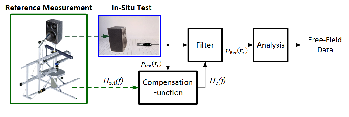 大多数标准测量都在单个点(例如轴上1m)上进行。现场房间补偿(ISC)模块通过计算得到一个补偿房间效果的复杂滤波器来应对不完美的声学环境。使用此技术,可以根据标准IEC 60268-21来获取模拟的自由场数据。