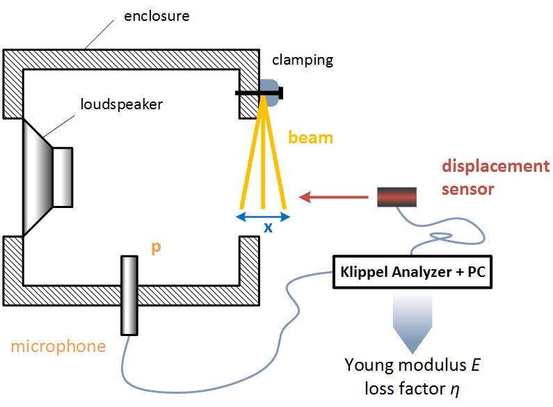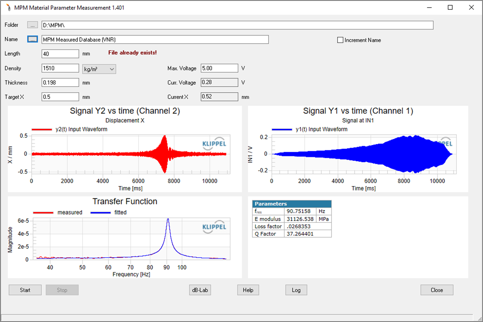 材料参数测量模块 (MPM) 测量用于扬声器设计的原材料的杨氏E模量和损耗系数η。对振动条技术 (ASTM E 756-93)进行了改进,使其能够测量柔软的材料,例如塑料、橡胶和任何种类的纸和浸渍织物的薄片。把材料样品切成1厘米的条带后,固定于SPM测量台(SPM Bench)的一侧,并进行气动激励。