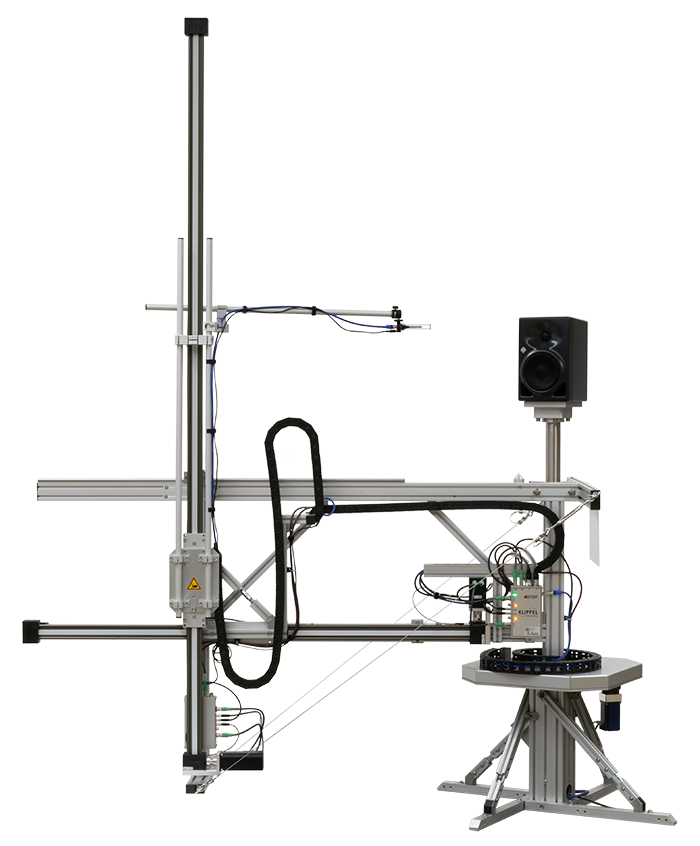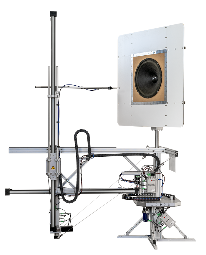 3D近场扫描仪使用移动的麦克风来扫描整体声源(如扬声器系统或安装在障板上的换能器)近场中的声压。被测设备(<500kg)在扫描过程中不会移动,这样,非消声环境中的反射就可以保持一致并通过新颖的分析软件进行监测,该软件使用声学全息和场分离技术来提取直达声并减少室内反射。