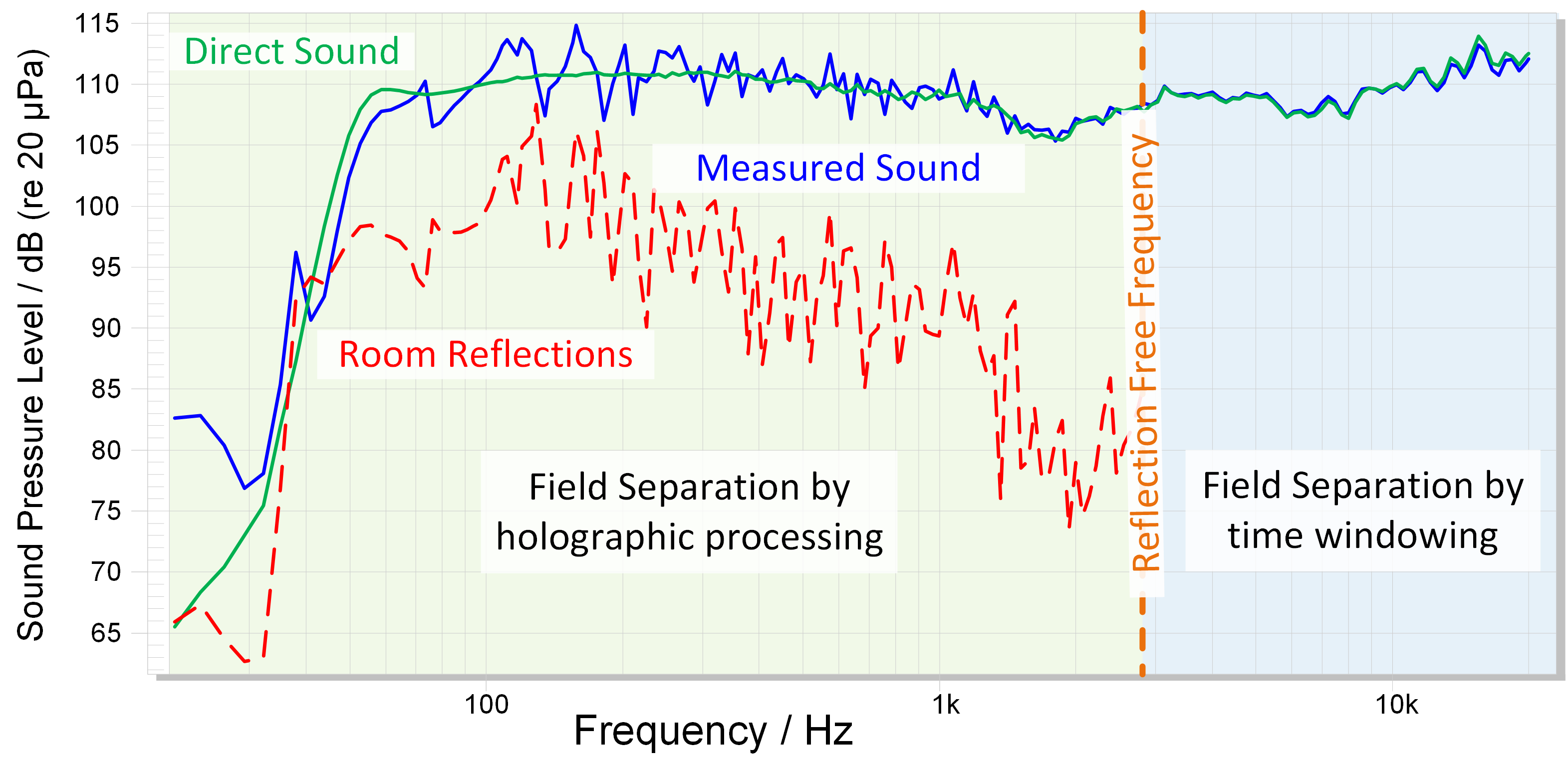 直达声分离方法解决了这个问题,将辐射声从反射和房间共振中分离出来。此方法对于无法应用加窗技术的低频段(低于1kHz)非常有用,在这样的频带中,即使很好的消声室,也会有房间模式产生。