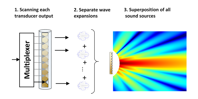 通过使用多路复用器分别测量每个换能单元,可以确定具有多个换能器单元的扬声器系统(线阵列、条形音箱、三分频系统等)的声压输出。全息处理后,可以叠加各个声源的声压以确定音频设备的总声压输出。