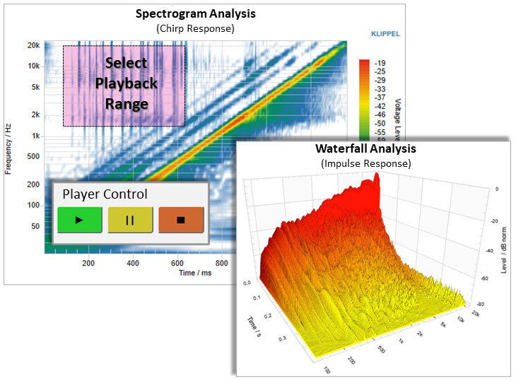 对于额外的主观诊断,TFA集成了一个专用的播放器功能,可以对信号部分进行可变播放速率的可听化,这些信号部分可以在声谱图中直接进行选择。
