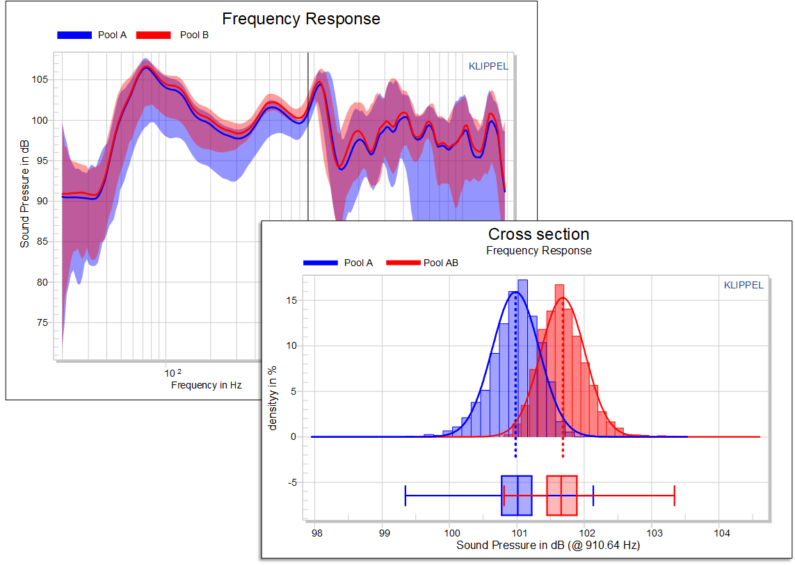 统计分析(STAT)模块是用于比较和分析来自产线或原型批次的大量测试数据的强大工具。该工具使得可视化最小/最大范围和数据池的差异变得容易;该模块读取Klippel(RnD和QC)数据, 并在图表和表格中显示统计信息。被测对象被归入不同的样本池中, 并根据它们的分组比较所有测试结果的统计信息。可以手动、半自动(通过限定阈值)或全自动(例如通过界限值)来分配样本池组。STAT可以帮助用户实现大海捞针的功能!