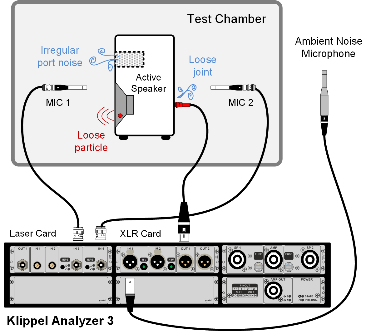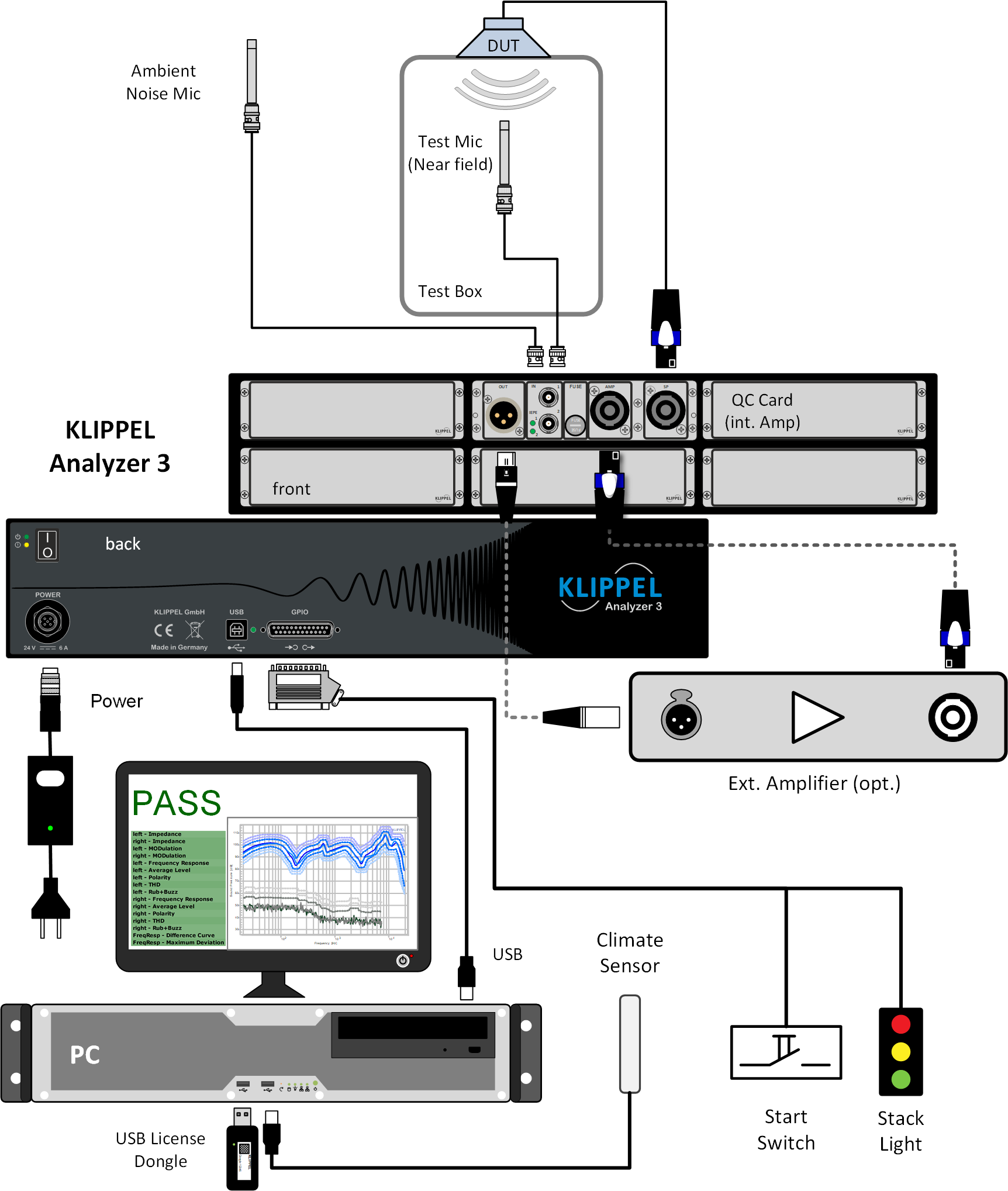 测试单个驱动单元的基本设置包括带QC或(A)LSX配置的KLIPPEL Analyzer 3、外置功放(可选)、麦克风和运行KLIPPEL QC软件的计算机。KA3的功放卡和QC卡提供集成功放。只有高电压或高功率要求的情况下才需要外置放大器。大多数情况下, 将DUT和近场麦克风安装在测试箱中, 以提供一定程度的环境噪声衰减。但是, 完全噪声抗扰则只能通过基于外置环境噪声麦克风的生产噪声检测或者生产噪声免疫(PNI)来完成。