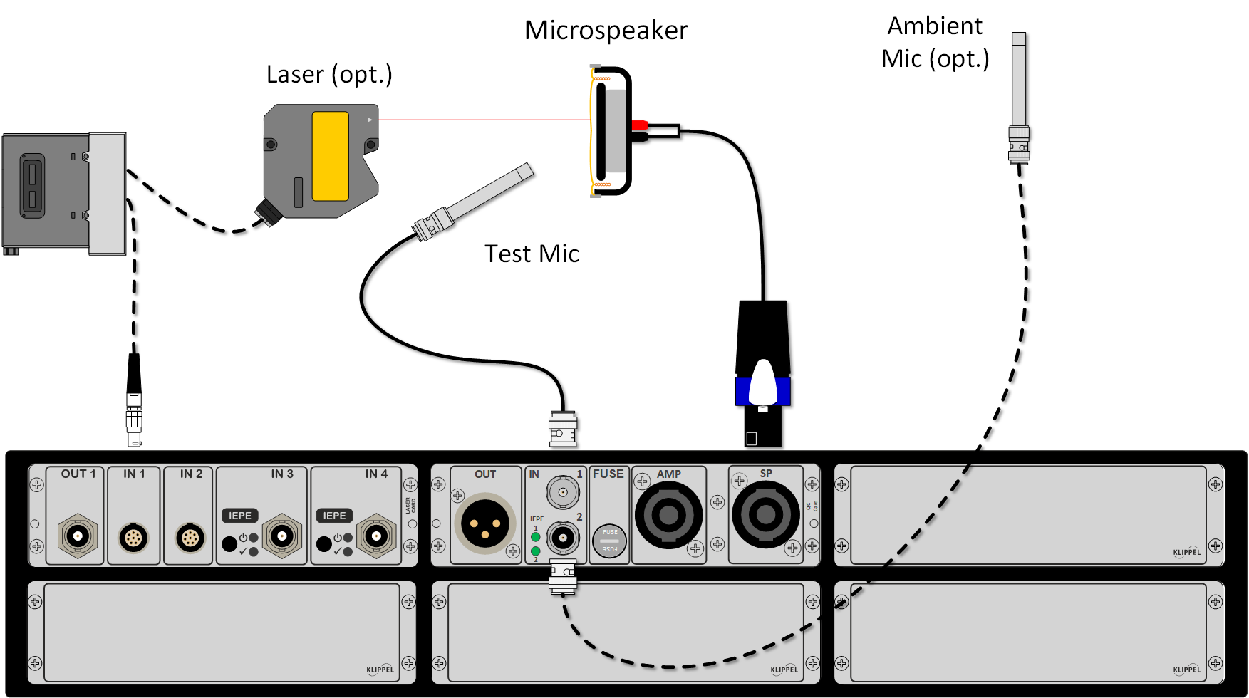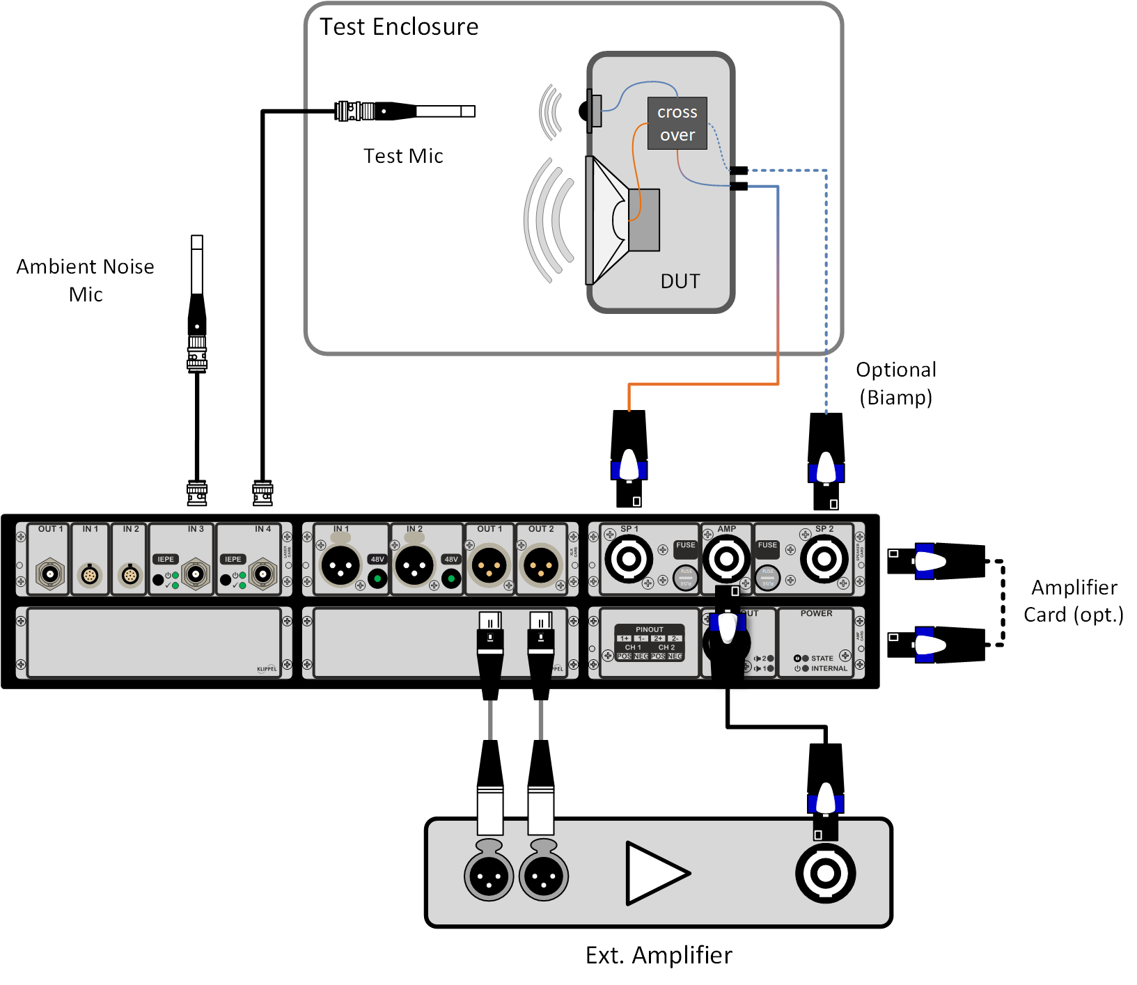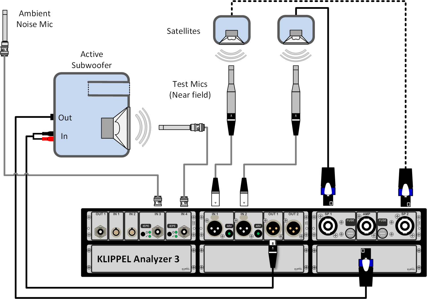 具有内置功率放大器的有源系统可直接连接到XLR输出。在此示例中,卫星扬声器是无源的,因此也可以进行电气测试(阻抗、T/S和大信号参数)。通过使用近场麦克风评估总的声音输出,位于远场的第二支麦克风检测环境噪声。