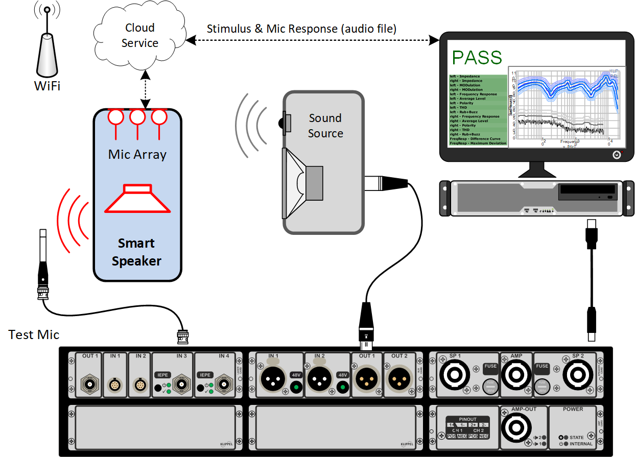 However, this concept based on a dedicated soundproof chamber is not suitable in many cases. Therefore, a scaled-down, price-efficient approach for smaller companies, secondary test sites and mobile test setups is suggested in Application Note AN79b. Together with Tech Note TN17 - Setting up Dante & Powersoft Mezzo for QC Stand-alone, this concept relies on a minimal set of hardware components using a Dante® compatible audio-over-IP amplifier with integrated voltage and current sensors as the main test frontend operated with QC Stand-alone Software version. It also suggests a simple and effective test strategy that relies on a small set of single value, relative metrics that can be tested against universal pass/fail and grade limits.