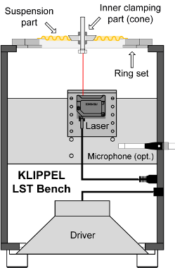 使用成套安装环套件(可选)的某一环将圆形弹波安装到测量台上, 并通过弹波的颈部直径选择用于内部夹紧的锥体。此应用中, 虽然声压测量是可选的, 但为了得到最佳精度(谐振器参数拟合),建议使用。一旦测试台调整好且软件属性设置好, 就可以在非常短的周期时间内测试大批量的弹波。DUT仅通过重力置于测试台上, 这样可以最大程度地减少安装时间,但对于软悬挂部件, 可能还需要使用附加的上部夹紧环。