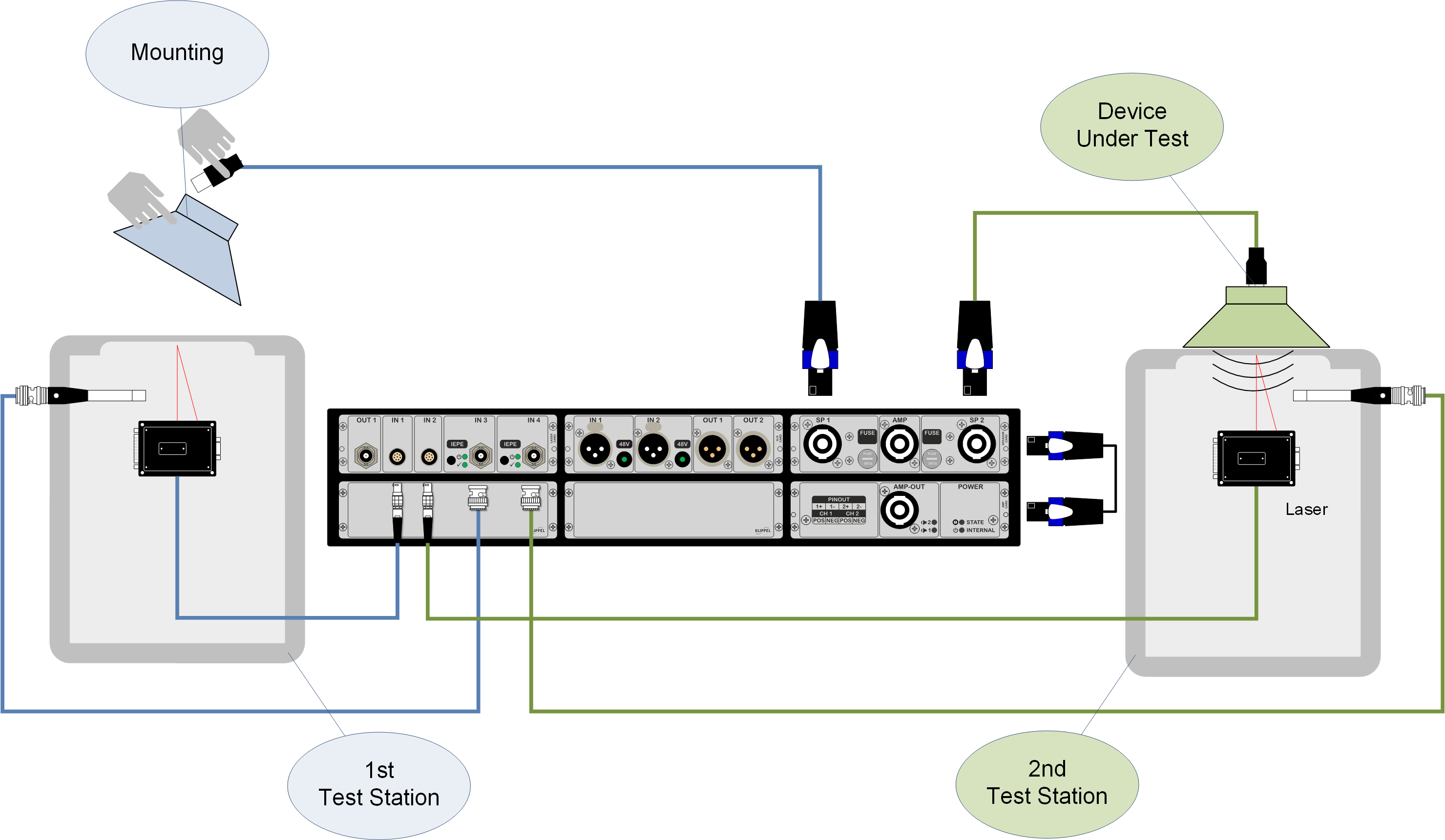 使用麦克风阵列时,同时输入通道的数量通常受分析仪(例如KLIPPEL Production Analyzer)的限制。此示例中,四个测试麦克风由多路复用器切换以进行顺序测试。测试室外部的另一支麦克风可以并行监视环境噪声。测试室可确保较低的声学底噪,以实现最大的测量灵敏度,同时麦克风可以可靠地检测脉冲干扰。