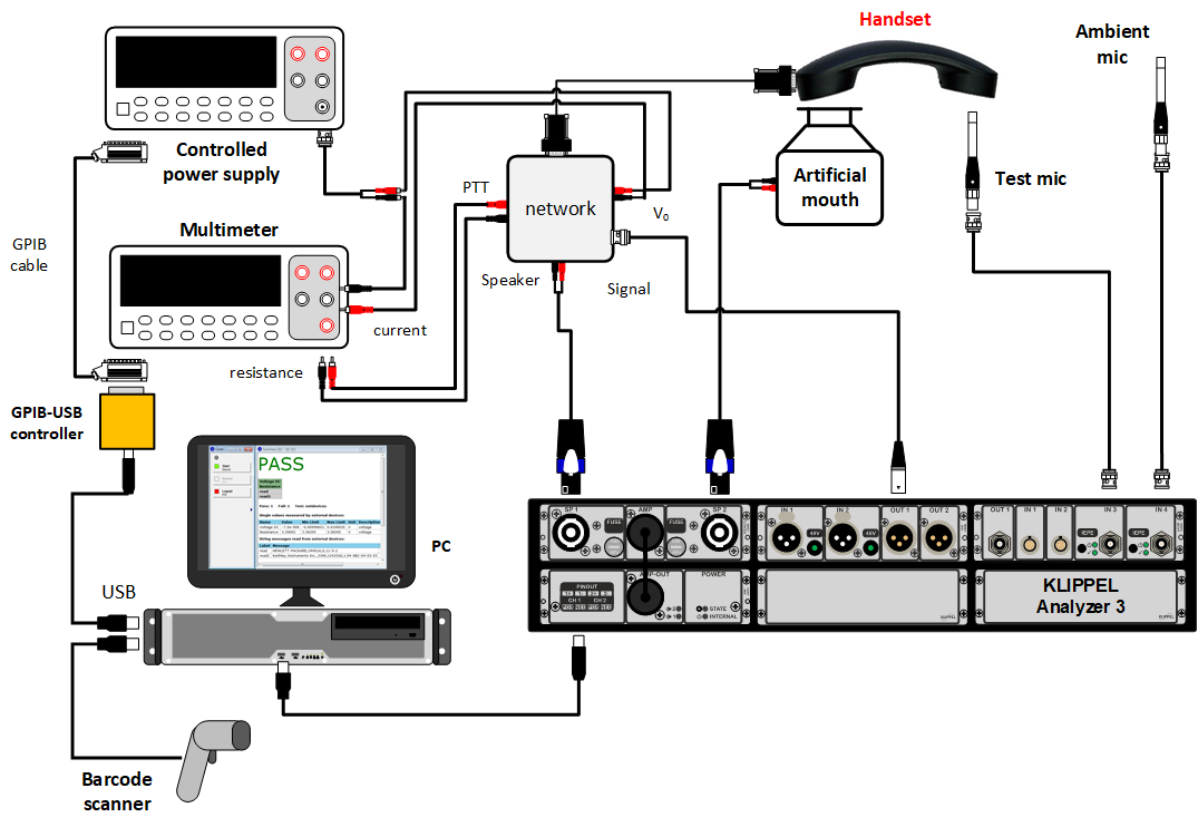 该图显示了测试包括电子和声学设备的示例测试场景。DUT的电源电压由带有GPIB接口的可编程电源提供, 并由EXD任务进行控制。使用数字万用表来测试手提电子设备的直流电流和电阻。EXD序列触发测量, 并根据界限检查结果进行PASS/FAIL判定。通过使用KLIPPEL Analyzer 3和QC声压(SPL)任务, 上述测试都可以合并到听筒和麦克风的声学测试中。