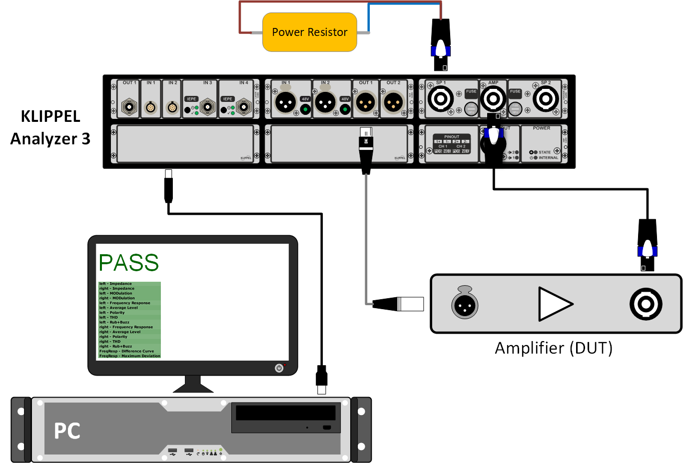 通过放大器(DUT)的环入回路并将功率电阻连接到分析仪的输出,可以在实际高功率负载条件下测试两个功放通道(可通过speakON多路复用器扩展)的放大器输出电压和电流。基波频响、相位、谐波和脉冲失真可以使用chirp信号在不到一秒时间内测得,而短期峰值功率则需要如多音(MTD)、噪声或自定义音频激励(SAN)之类的宽带信号来测量。