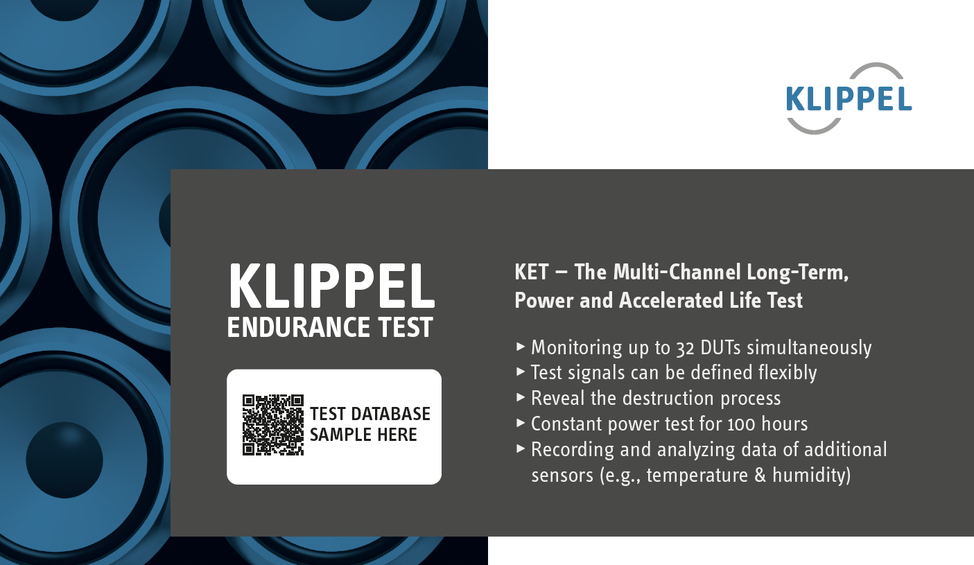 When purchasing speaker systems, consumers expect them to have undergone rigorous quality testing to ensure longevity and performance. Therefore, loudspeaker developers and manufacturers should conduct service life tests to understand how their products behave over time and in various environmental conditions. This requires time-consuming long-term tests, which were previously limited in scope and control. KLIPPEL's multi-channel endurance tests provide a simple, effective and scalable solution for analyzing and evaluating passive audio systems and transducers (woofer, micro-speaker, headphones) over time. Conforming to international standards (e.g., IEC 60268-21), the Klippel Endurance Test (KET) offers long-term max SPL testing, accelerated life testing, destructive testing with death reports, and thermal stress testing. Loudspeaker designers and manufacturers should implement these tests for typical quality assurance applications, to receive valuable statistics for traceability of data and gain a detailed analysis basis for the development department.