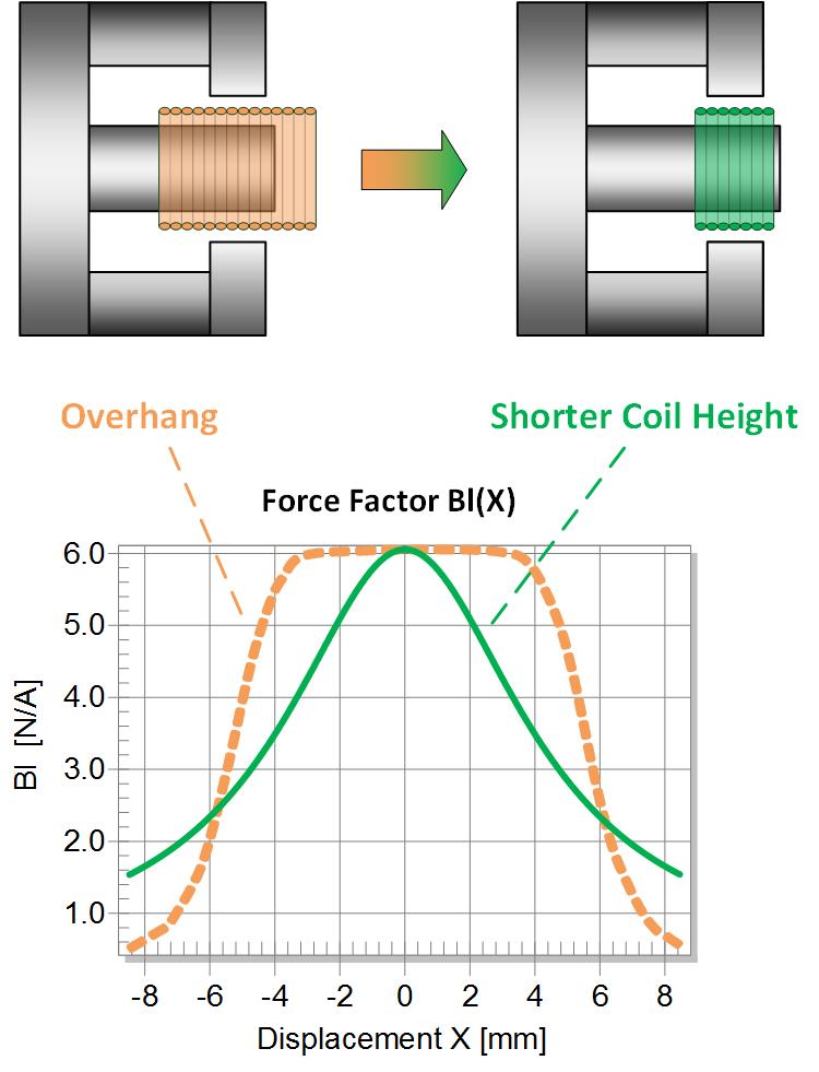 例如,在保持相同的极板、磁铁和其他换能器部件的同时,可以大大降低音圈的高度,这样可以显著提高效率和电压灵敏度,因为电阻Re和振动质量Mms减小了。